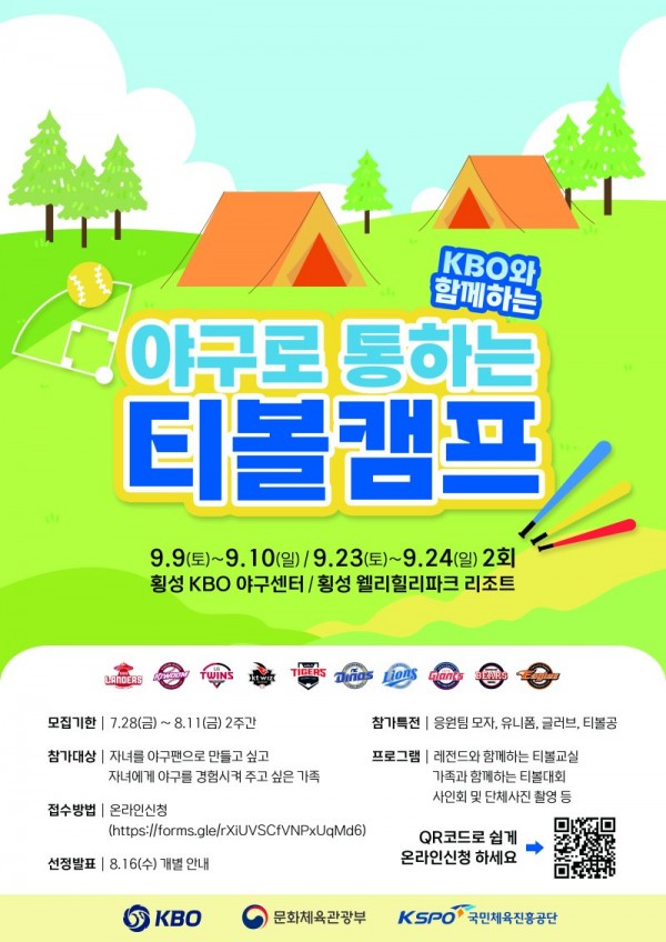 한국야구위원회(KBO)가 야구로 통하는 티볼캠프 참가 가족을 모집합니다. 이 캠프는 초등학생들에게 티볼 체험을 제공하여 어린이들의 야구에 대한 흥미와 관심을 높이고, 가족과 함께하는 야구 활동을 통해 가족 단위 야구팬을 확보하는 것을 목표로 하고 있습니다. 캠프에서는 KBO 레전드와 함께하는 티볼 교실, 가족과 함께하는 캐치볼 및 티볼 대회, 레크리에이션 등 다양한 프로그램이 제공될 예정입니다. 캠프는 1차는 9월 9일부터 10일까지, 2차는 9월 23일부터 24일까지 강원도 횡성 KBO 야구센터와 웰리힐리파크 리조트에서 진행되며, 캠프 1회당 각각 초등학생 1명과 보호자 1명으로 이뤄진 50가족이 참여할 예정입니다. 참가비는 전액 무료이며, 참가자들에게는 응원 구단의 유니폼과 모자, 티볼용 글러브와 티볼 공이 제공됩니다. 캠프 참가를 희망하는 가족은 신청 링크를 통해 신청할 수 있으며, KBO는 사연 검토를 통해 캠프 별로 응원 구단 당 5가족을 선정하여 개별적으로 연락할 예정입니다. 이 캠프는 자녀를 야구팬으로 만들고 싶고, 자녀에게 야구를 경험시켜 주고 싶은 가족 누구나 지원할 수 있습니다. 모집과 관련된 자세한 사항은 KBO 소셜 미디어 채널 및 KBO 홈페이지에서 확인할 수 있습니다.