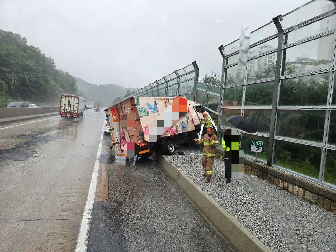 2일 오전 1140분쯤 강원도 원주시 무실동 중앙고속도로를 달리던 25톤 화물차 1대가 빗길에 미끄러지면서 방음벽을 추돌했다.