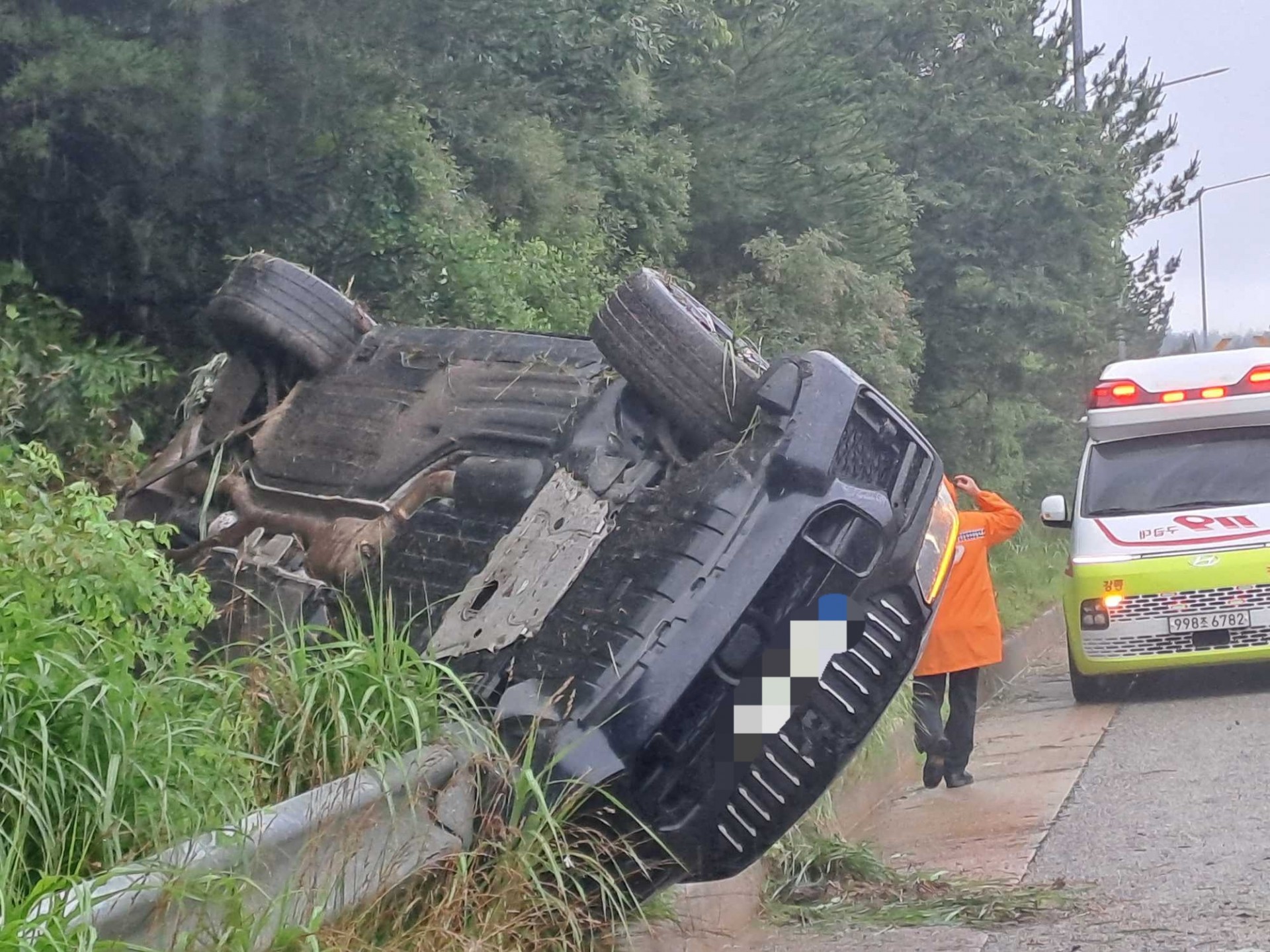 강원특별자치도소방본부에 따르면, 8일 낮 1221분쯤 강릉시 사천면 석교리에서 SUV 1대가 빗길에 미끄러지면서 넘어졌다.